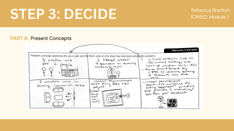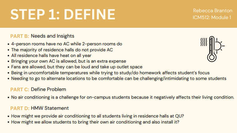 After asking a few follow-up questions, I moved into the second stage of the process and defined the problem; no air conditioning is a challenge for on-campus students because it negatively affects their living conditions. With that in mind, how might we provide air conditioning to all students living in residence halls at Quinnipiac?