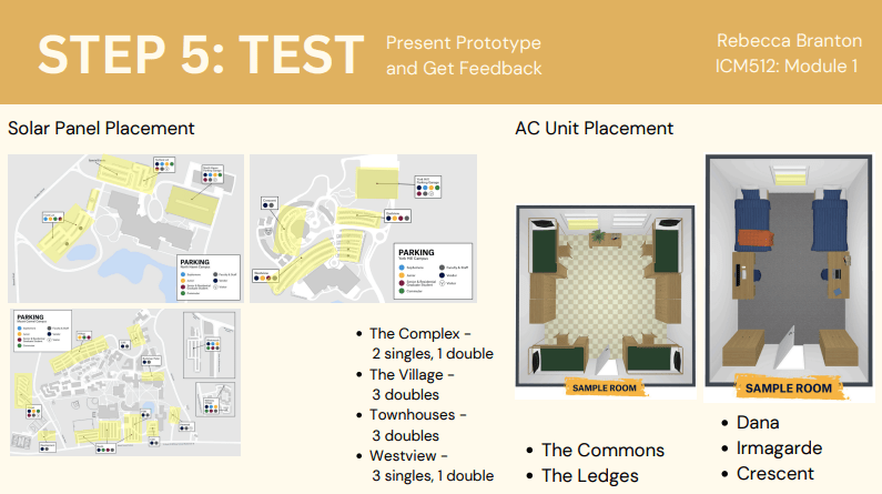 I then created and shared my final prototype with Maeve and received more feedback. She thinks the idea of having one unit installed per bedroom and raising room and board costs by ~$150 to account for the new units and solar panels is a solid solution. She states, “While parents may dislike the idea of cost increasing, I think they dislike their child being uncomfortable more.” She suggests that instead of adding structures to the parking lots for solar panels, the roofs of residence halls are easily accessible for maintenance and would utilize structures already on campus.