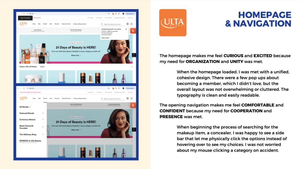 I began with Ulta’s site. This is where I typically shop in person, so investigating their online presence sounded like a treat. With each click, I created feel/need statements that described how I felt throughout the process. For example, I stated that the homepage of Ulta’s website makes me feel curious and excited because my need for organization and unity was met.