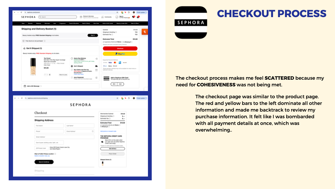 These feel/need statements are a simple way to gather information from your user in a concise manner. Despite feeling almost elementary, they directly provide a designer with what is and is not working for users. In my experience, Ulta’s website was concise, organized, and enjoyable to navigate overall.