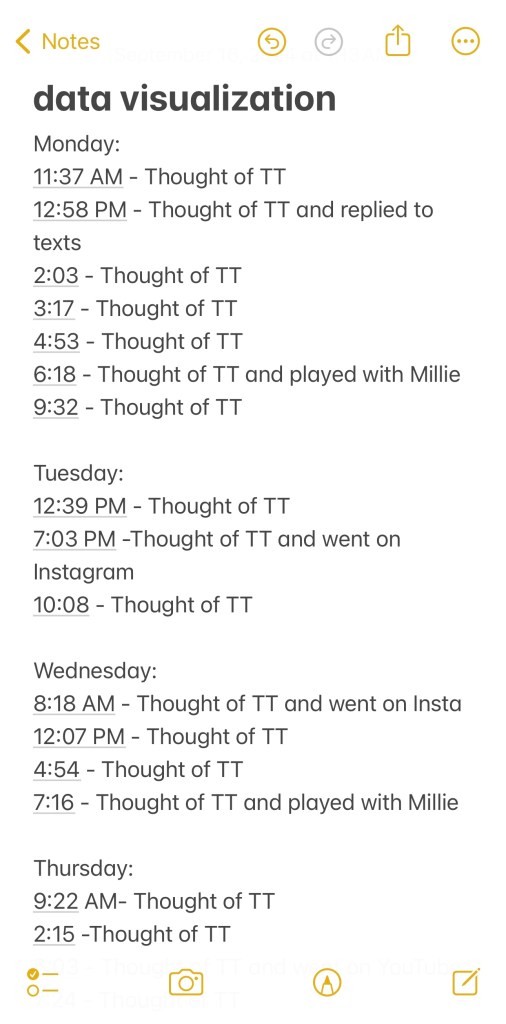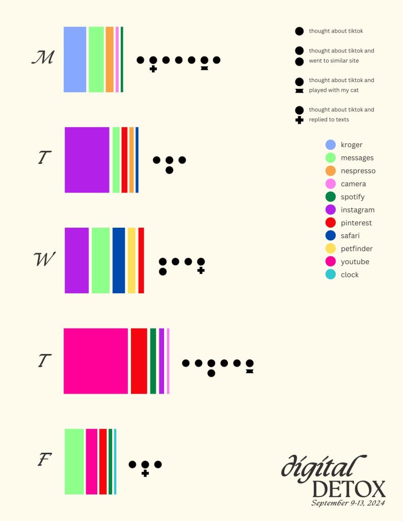 This exercise had its difficulties, like remembering to record each time I thought about TikTok, but seeing this week’s behavior laid out visually helps me understand how I’m spending my time and what I can work on to continue improving my screen time. As I write this two days post detox, I still haven’t opened TikTok.