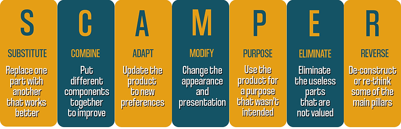 Scamper is an acronym for substitute, combine, adapt, modify, put to another use, eliminate, and reverse. By asking questions related to these verbs, designers can look at existing structures and create something new from it.