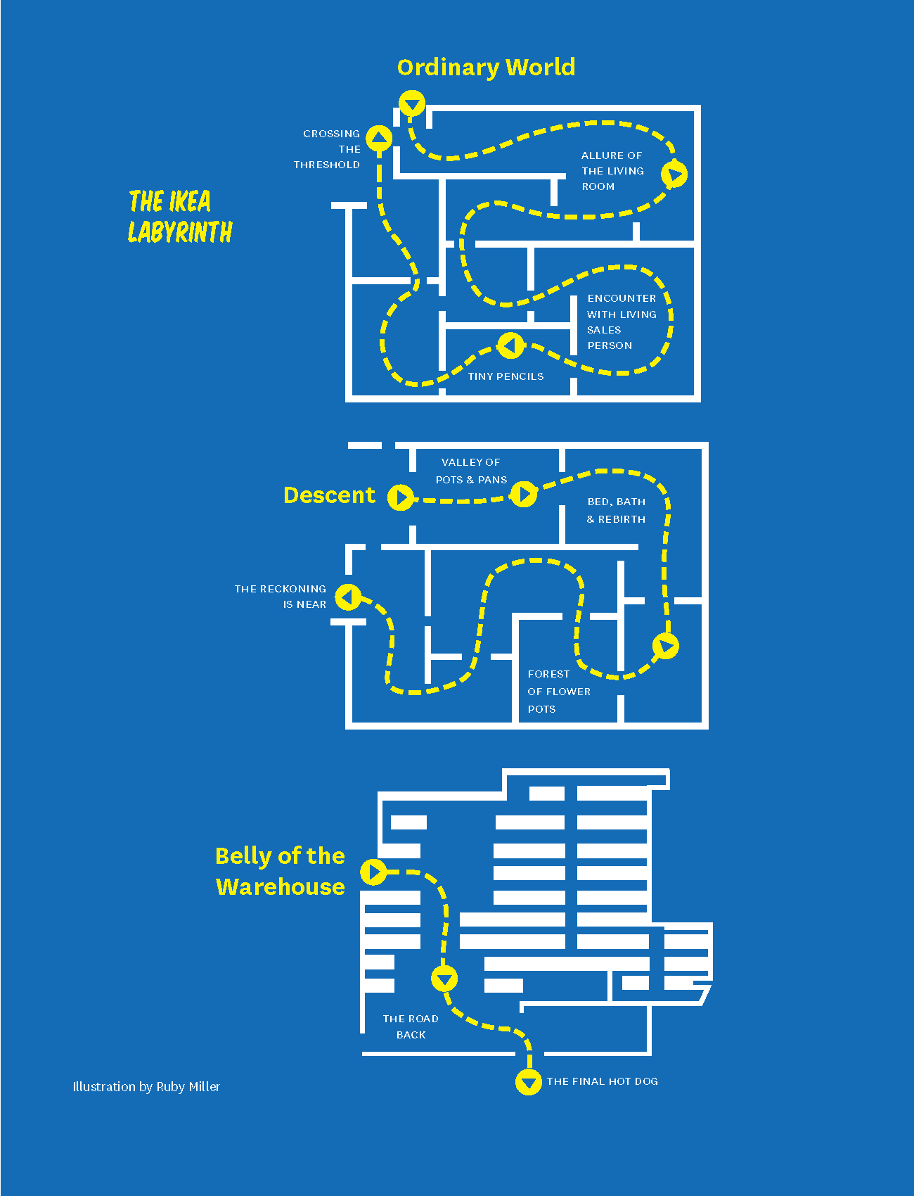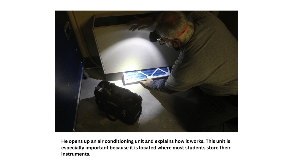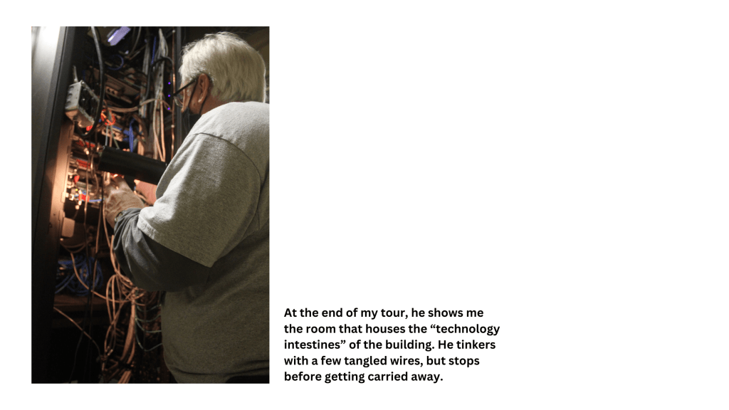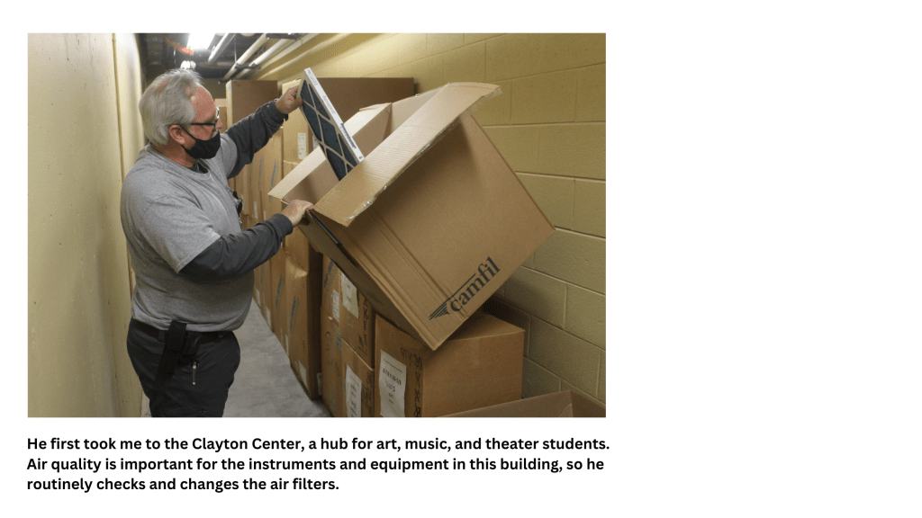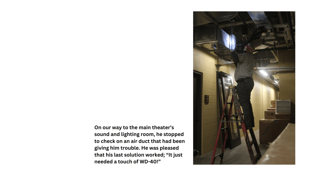 After taking the photos, I selected a handful with Plutchik’s wheel of emotions in mind. I wanted images that encourage joy and anticipation, so most photos show Jim in action to draw the audience in and have them feel intrigued by what he’s doing. As I scrolled through, I realized that the tour he gave me followed the pattern of a hero’s journey similar to Ellen Lupton’s depiction of Ikea. We began in a well-lit hallway that most staff and faculty can access. After grabbing a few air filters, we began trekking into more exclusive parts of the building, like the catwalk above the stage and the steam pipe room. After a journey to the center of Clayton, we slowly made our way out and back to more high-traffic areas.