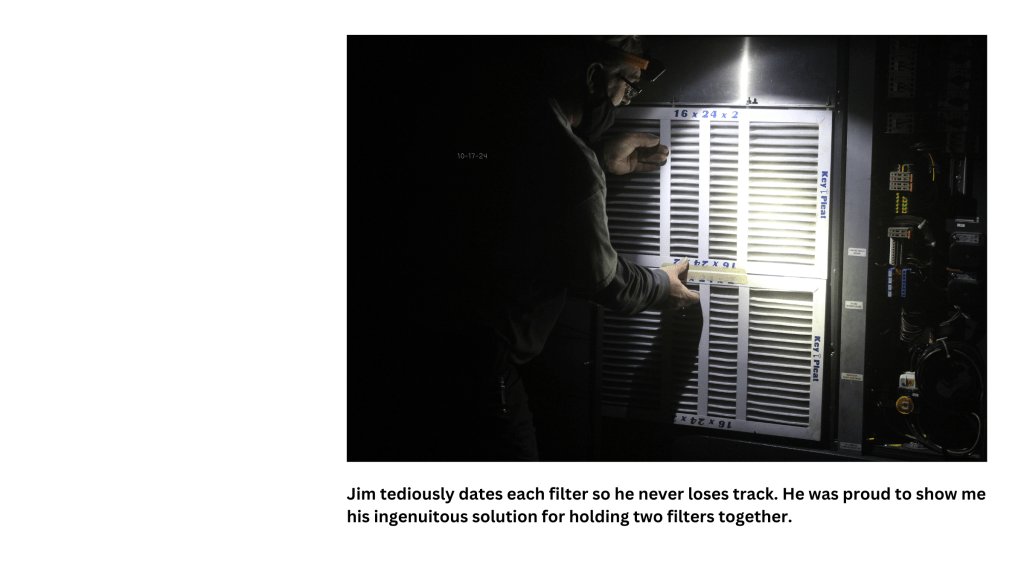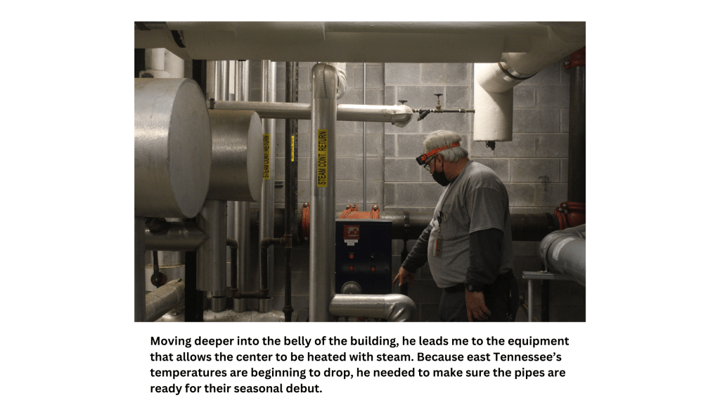 Jim Branton is a simple man. Born and raised in rural Louisiana, he traded his hunting rifles and fishing poles for a white sailor uniform. He joined the Navy when he was 23 and was first stationed in California. There, he met his bride and continued to serve for 24 years, moving his family to 6 different states. Once retired, he put his military skills to use in several factories and warehouses. After a few years, he began a job at Maryville College, a small school in his retirement town of east Tennessee. He is responsible for making sure equipment is up to code and functioning properly. He likes this position because he enjoys fixing things, gets to spend time outside, and has his very own work truck. This past week, I had the pleasure of shadowing him to see what a day at work looks like for him.