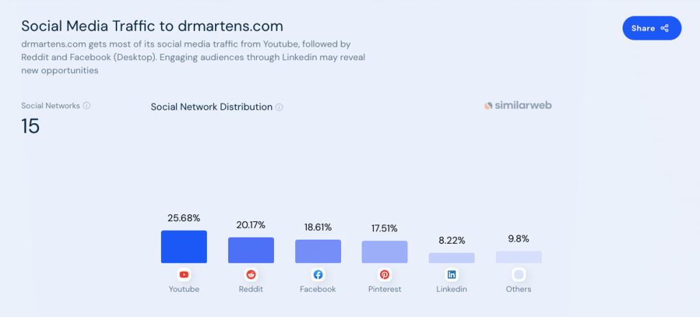 The brand seems to prioritize a more generic advertising strategy to cater to all genders and ages. Because of the brand’s age and reputation as an alternative, versatile apparel choice, Dr. Martens’ website traffic is predominantly achieved through direct searching. To cater toward their largest age demographic, 25-34 year olds, the brand uses YouTube as their main social media platform.