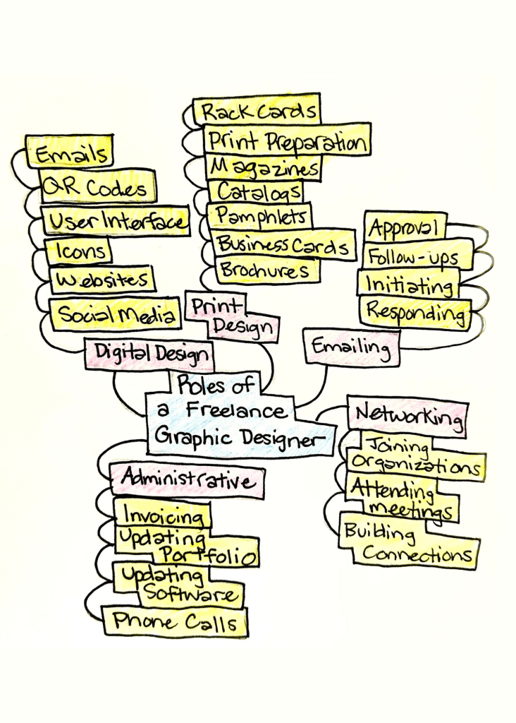 As I thought about what my typical day looks like, I began listing my five overarching responsibilities: print design, digital design, administrative tasks, emailing, and networking. Within each of these sections are more specific tasks that I run into on a daily basis. Before freelancing, I wasn’t familiar with how to invoice or where to begin when it came to gaining clients. I recommend that every aspiring freelancer should look into methods of invoicing and local networking outlets to better understand what they may experience after getting started.